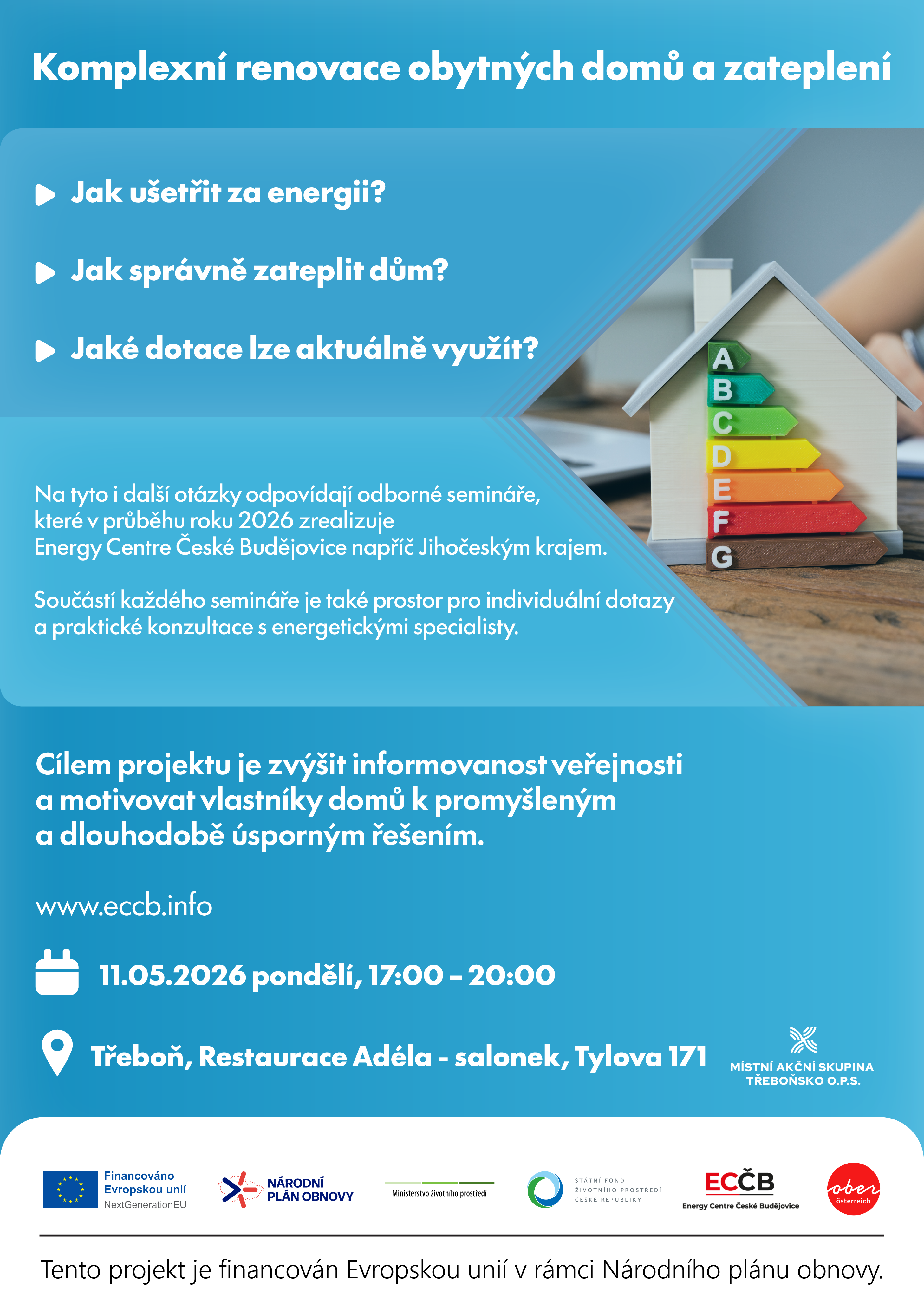 V pondělí 11. května se v salónku Restaurace Adéla v Třeboni koná bezplatný seminář zaměřený na úspory energie v domácnostech, praktické návody na správné zateplení domů a možnosti aktuálních dotací a je určen všem, kteří chtějí snížit náklady na energie nebo plánují úpravy svého domu.