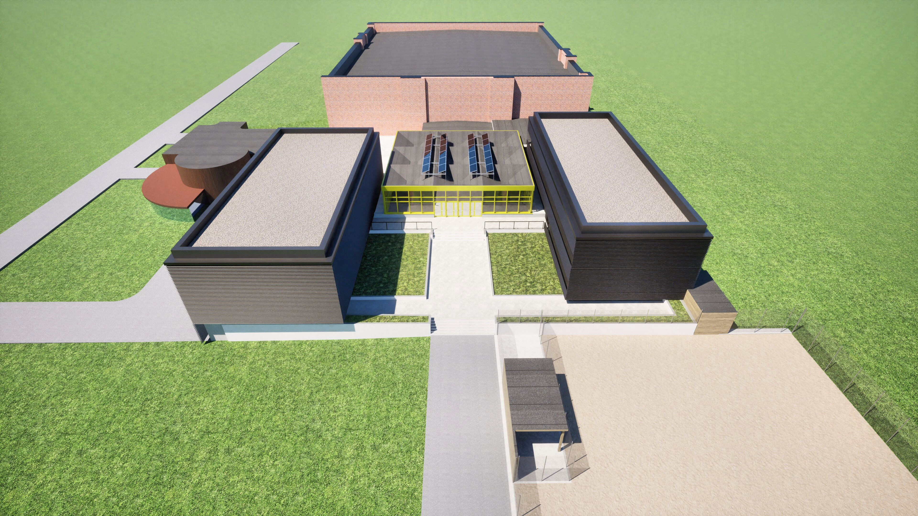 V příloze naleznete vizualizace areálu haly s rozšířením o ubytovací část a část tělocvičen.